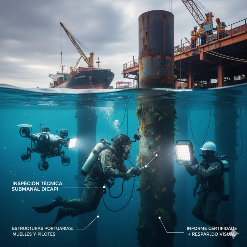 Comprende la ejecución de inspecciones técnicas bianuales o periódicas exigidas por la Dirección General de Capitanías y Guardacostas (DICAPI) y las autoridades portuarias competentes. Estas inspecciones verifican el estado estructural, funcional y de seguridad de muelles, emisarios, líneas submarinas, pilotes y otras estructuras metálicas, tanto en su parte sumergida como emergida.